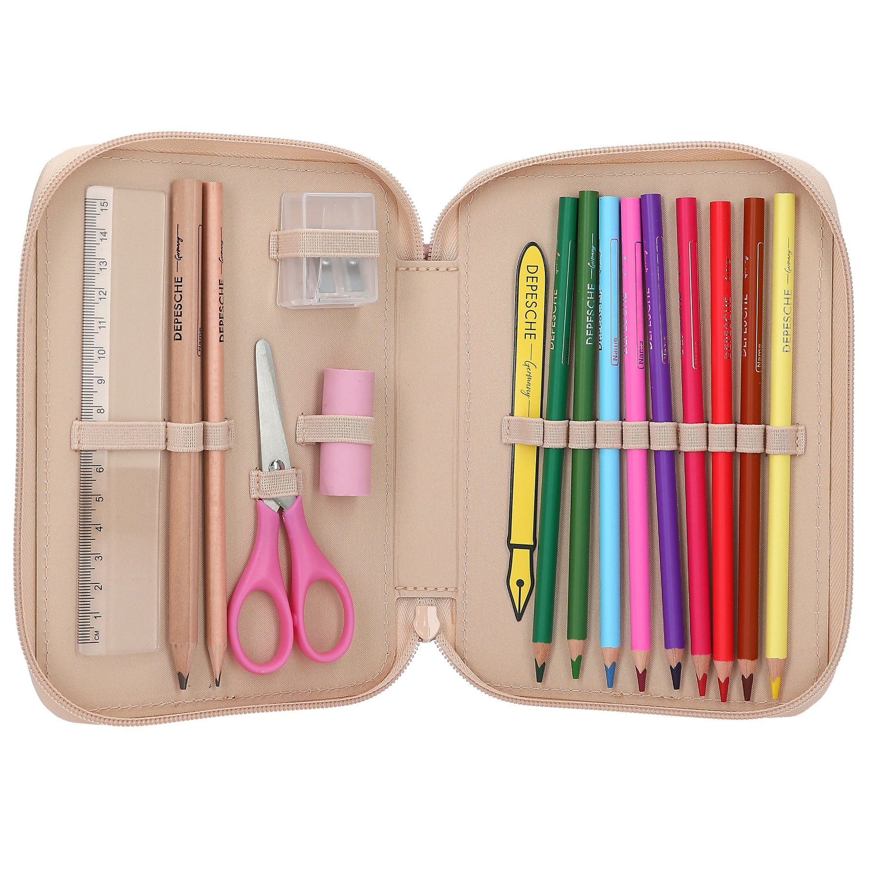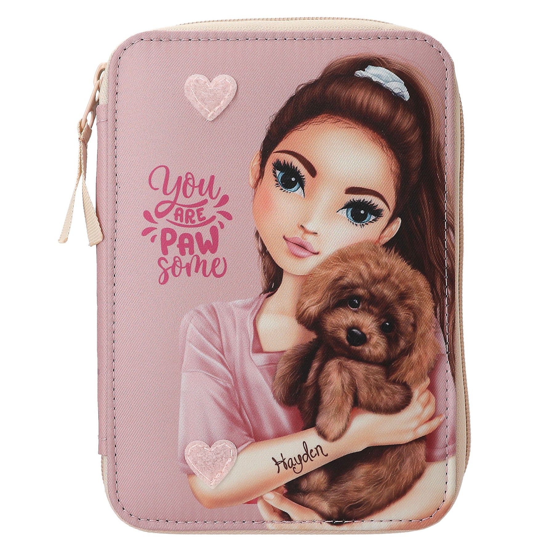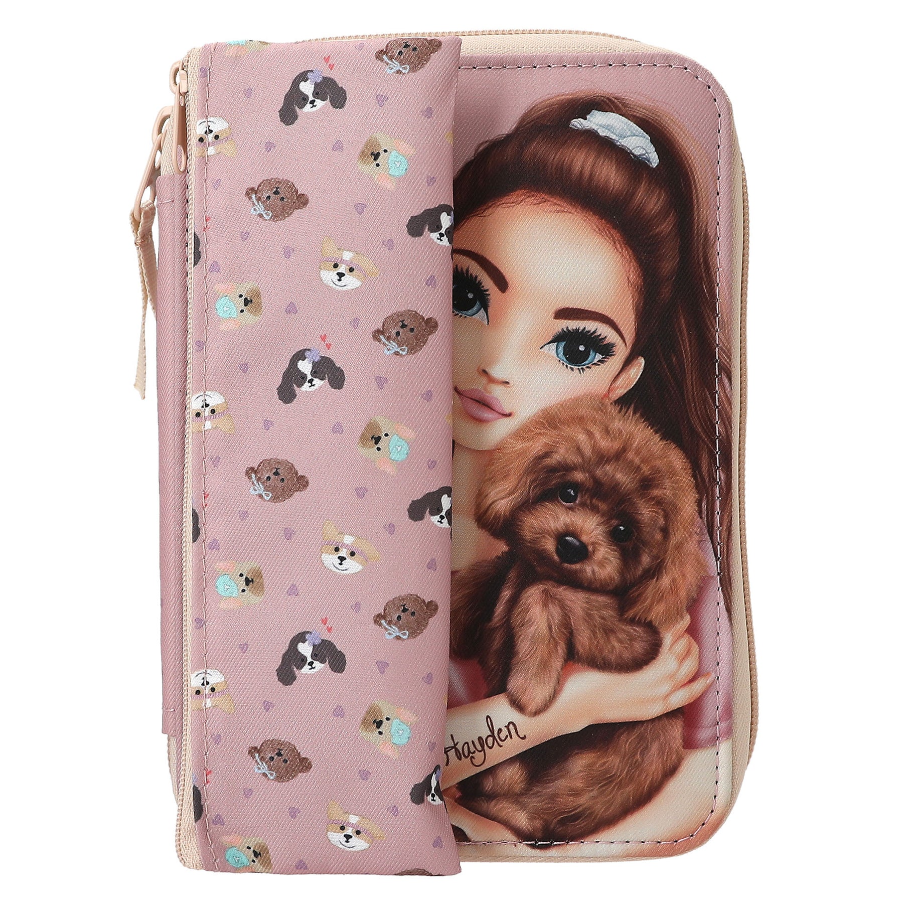 Pfotig niedlich: Die fliederfarbene TOPModel-Federtasche hat auf der Front ein großes Model-Motiv mit Hund. On top: eine schmale Schlampertasche mit einem supersüßen Hundekopf-Allover, die mit einem Klettverschluss befestigt und dadurch nach Belieben auch abgenommen werden kann. Die Federtasch ist komplett gefüllt mit 9 dünnen Buntstiften, Schere, Radierer, Doppelanspitzer und Lineal. Plus: eine freie Stift-Schlaufe für den Füller. Material: 100 Prozent Polyester
