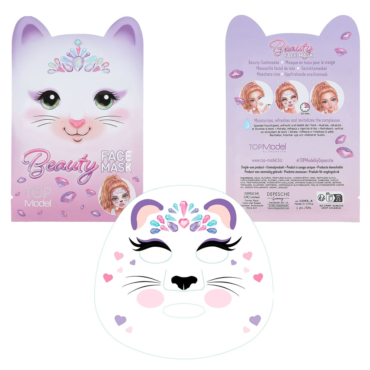 Für tierliebe Beauties gibt es die TOPModel-Tuchmasken mit drei verschiedenen Motiven: lila Kätzchen, blauer Eisbär und rosa Fuchs. Die kindgerechten Tuchmasken spenden Feuchtigkeit, erfrischen und beleben den Teint. Eine Tuchmaske pro Verpackung.