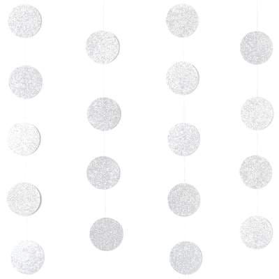 Verleihen Sie Ihrer Partydekoration mit der Genähten Girlande Kreise in Glitter-Silber einen aufregenden Look! 🎉 Perfekt für Indoor- und Gartenpartys. - 2 Meter lange Girlande - Glitter-Kreise - Kreisdurchmesser: 3,8 cm - Material: Papier