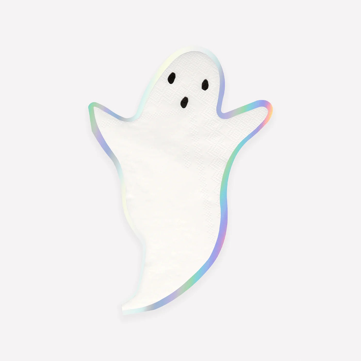 Buh! Verleihe deiner Halloween-Party mit unseren Servietten in Geisterform einen magischen Touch. Das klassische, schwebende Geister-Design mit funkelndem silbernem Hologrammfolienrand sorgt für einen gespenstisch-coolen Effekt – perfekt für kinderfreundliche Feiern oder schaurig-stilvolle Cocktailpartys!