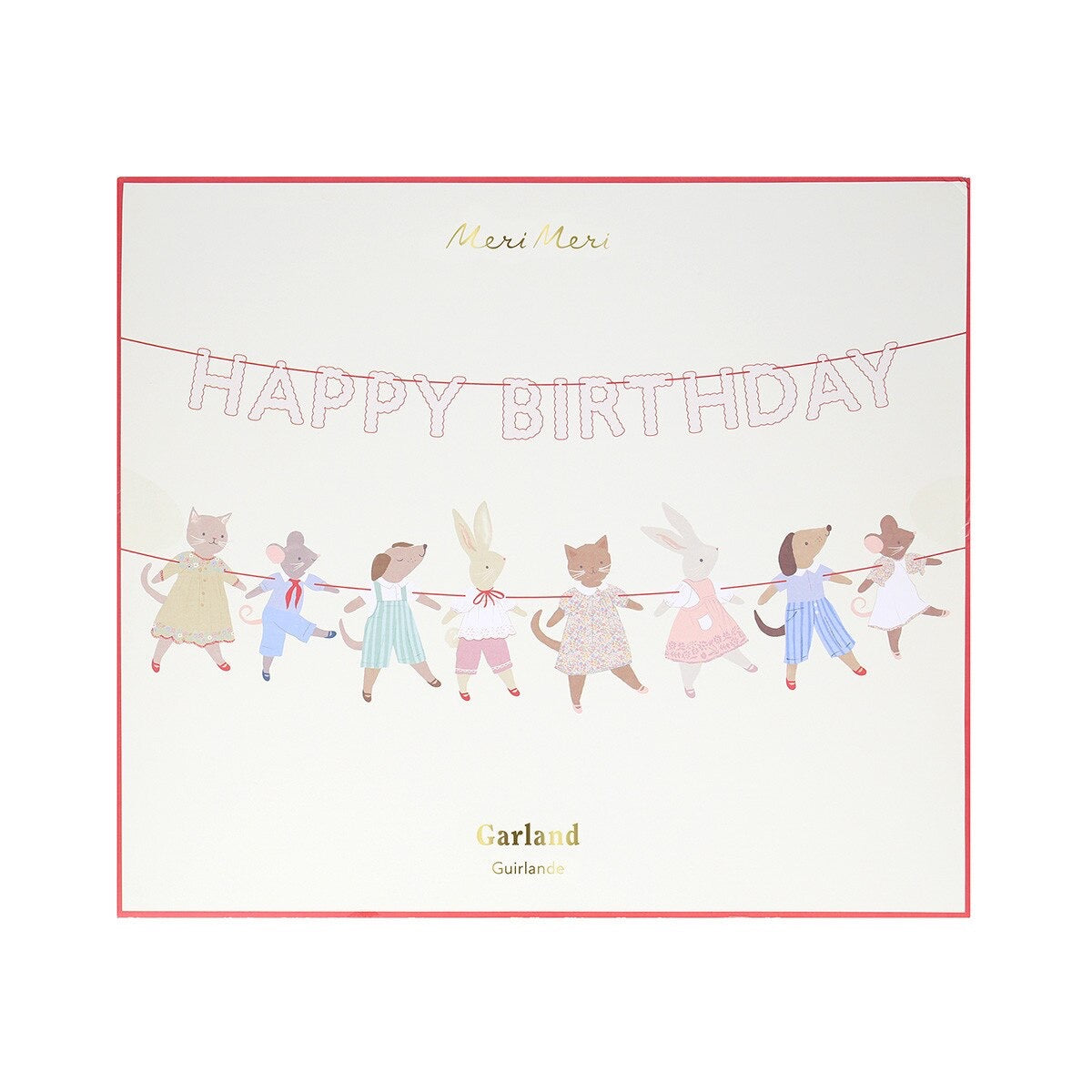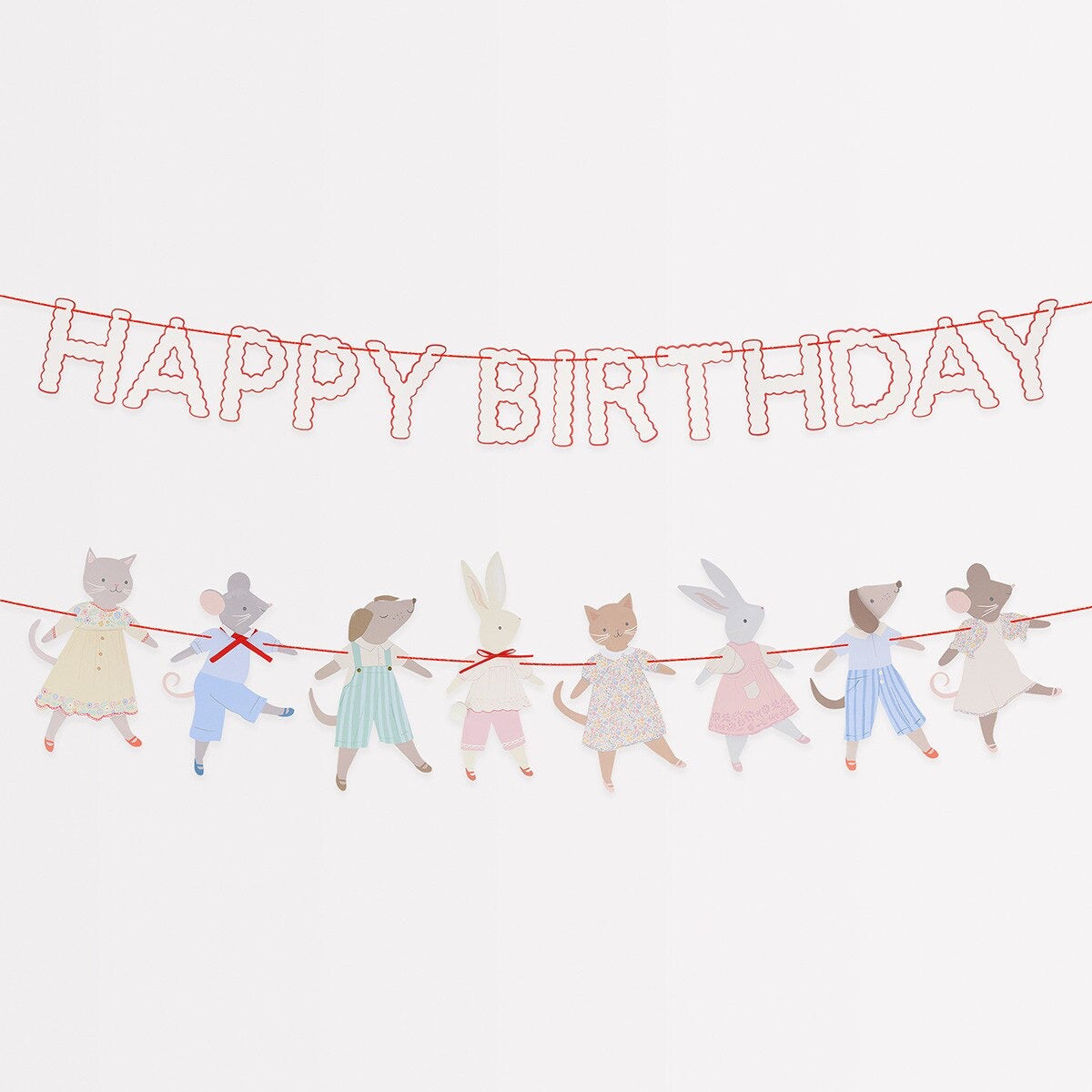 • Ein Strang zeigt „Happy Birthday“ auf cremefarbenen und roten Wimpeln