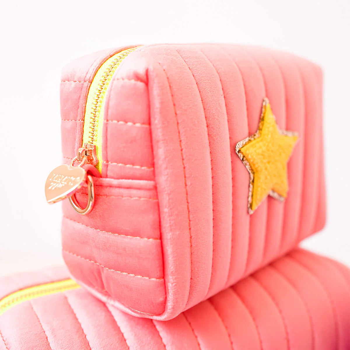 Kleine Make-up-Tasche oder Mini-Crossbody-Tasche? Dieses Samttäschchen ist multifunktional! Wer hätte gedacht, dass man an die seitlichen Ringe einfach unsere Handyketten als Taschenriemen klipsen kann et voilà: Die Lola Bag wird zur Umhängetasche! Personalisierbar mit unseren Chenille-Stickern – wir empfehlen, sie mit Alleskleber oder ein paar Stichen zu fixieren.