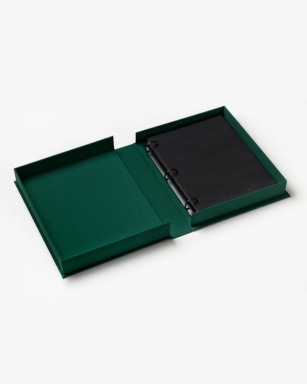 Discover our Sheer Joy Photo Album featuring an elegant, forest green cloth cover with blue foiled text. Inside, you'll find 30 pages of high-quality black photo paper, allowing you to attach your photos easily using our stickers or photo corners, which are bought separately. It accommodates two 10x15 cm photographs on each page, with space for personal notes below. If you need additional pages, you can order extra photo paper(large). Please note that the album can accommodate a maximum of 40 pages. The photo paper size is 28x21 cm.