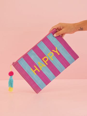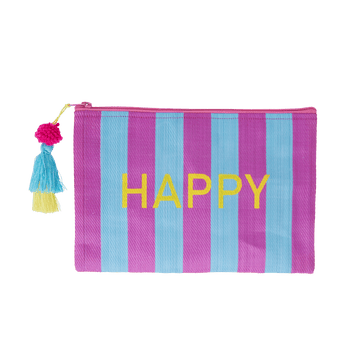 Niedliche kleine Tasche aus recyceltem Kunststoff mit blauen und lila Streifen, einer funky Quaste und "happy" Print. Befülle sie mit Bleistiften für die Schule, Kleingeld und Quittungen beim Einkaufen oder wichtigen Dingen, wenn du ausgehst. Nutze sie einfach ganz nach Lust und Laune.