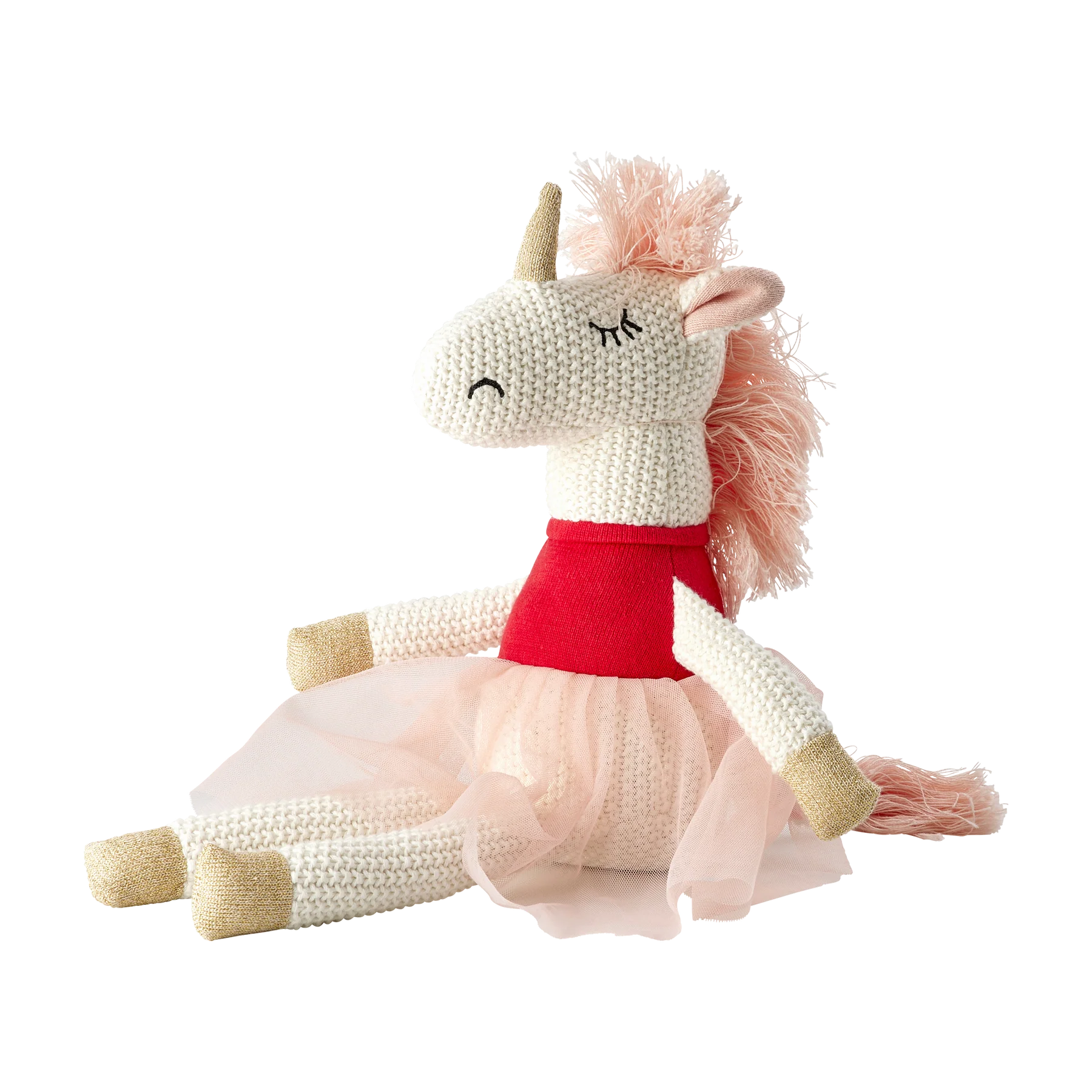 Niedliches Plüschtier in Form eines magischen Einhorns mit zartrosa Tutu, rosa Mähne und glitzernden Golddetails! Es ist gestrickt und superweich – perfekt als kuscheliger Begleiter oder Spielzeug für viele Spielstunden! Lasse deiner Fantasie freien Lauf und tanze durch deinen Tag.