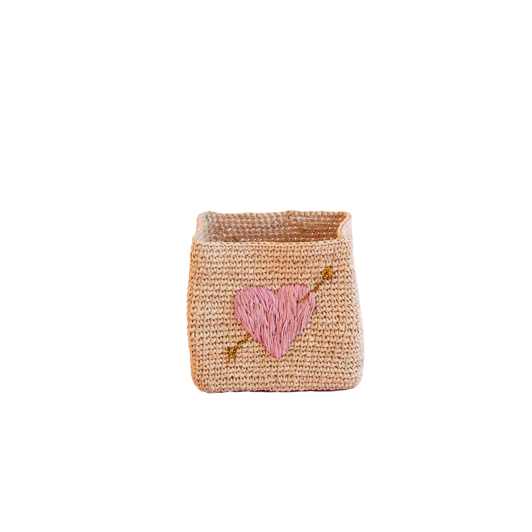 Kleine Quadratisch Raffia Aufbewahrungskorb - Natürlich - Pink Heart Embroidery
