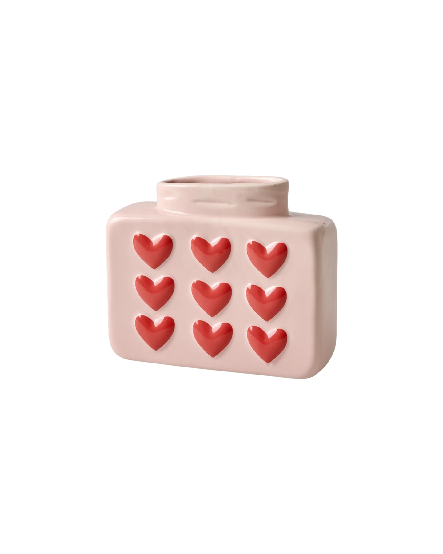 Wunderschöne und ausgefallene kleine Vase in einem zarten Rosa mit roten Herzen. Sie besteht aus Keramik und ist perfekt für ein kleines Blumensträußchen, ein Bündel Stifte oder ein paar Make-up-Pinsel.