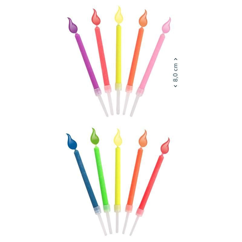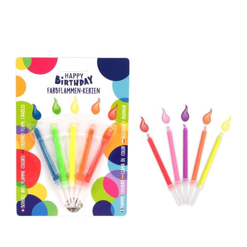 Dieses Set enthält fünf bunte Farbflammen-Kerzen, die jede Party zum besonderen Highlight werden lassen. Die Flamme jeder Kerze brennt in ihrer bunten Kerzenfarbe ca. 9 Minuten. Kerzen inkl. Halter: ca. 8,0 cm