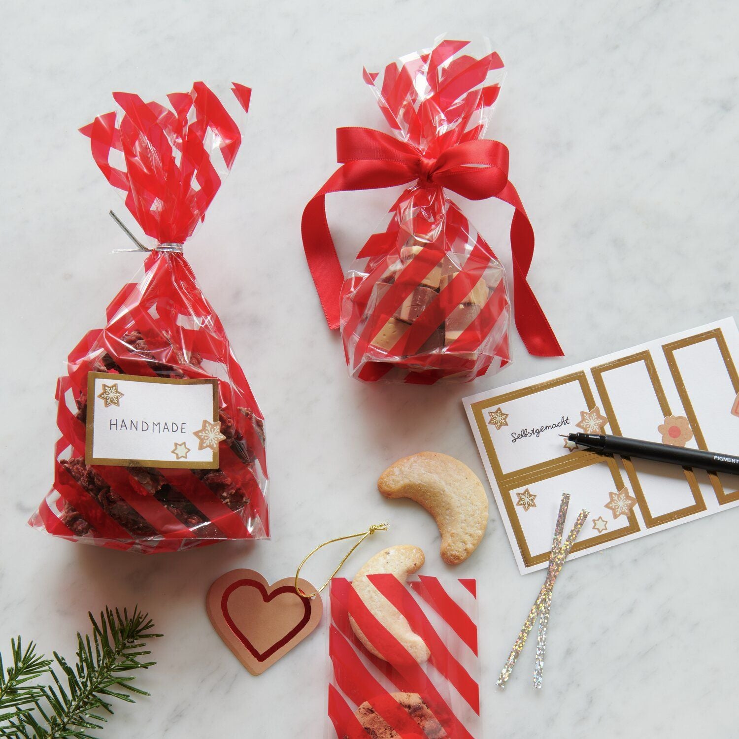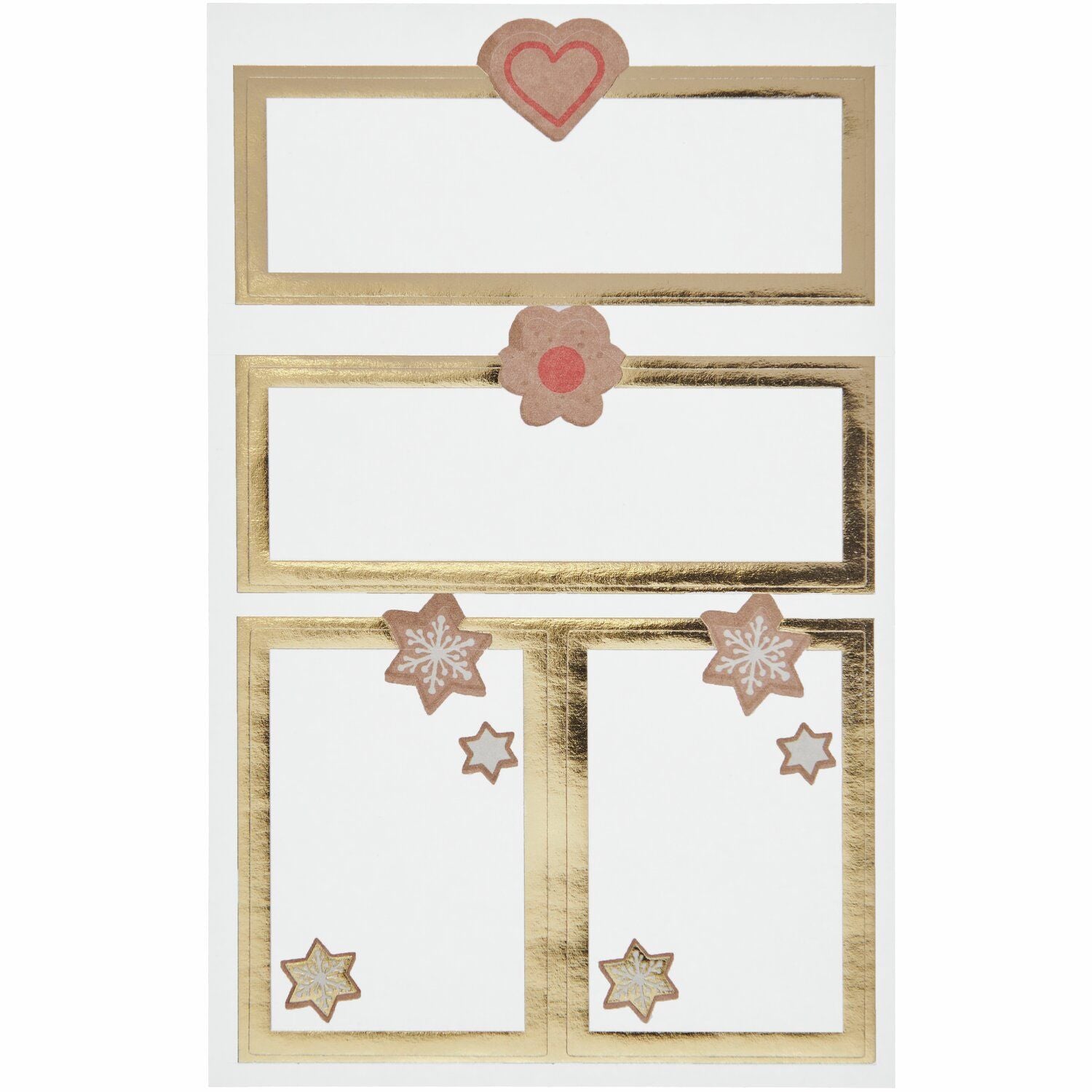 Diese Papieretiketten mit Goldrand und Plätzchen-Motiven eignen sich ideal zum Beschriften von Geschenken in der Weihnachtszeit. Die detailreichen Motive setzen verspielte und festliche Akzente auf Verpackungen. Die Etiketten lassen sich leicht beschriften und aufkleben und sind optimal für kreative DIY-Geschenke.