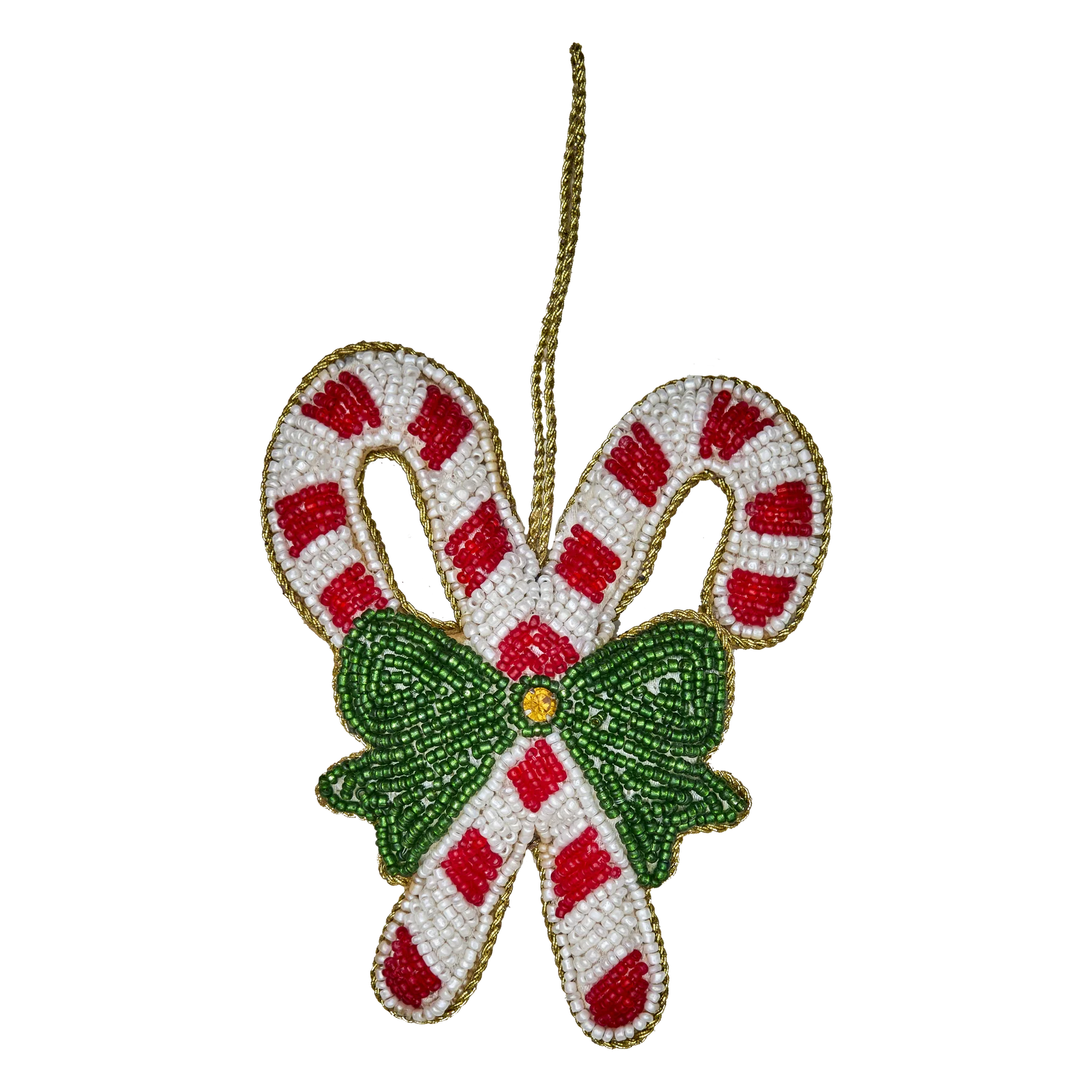 Mit diesem wunderschönen hangefertigten Ornament verleihst du deinem Zuhause etwas Weihnachtszauber. Es ist mit Perlen besetzt und hat die Form zweier Zuckerstangen, die mit einer wunderschönen grünen Schleife zusammengebunden sind. Es wird auf jeden Fall wunderschön an deinem Weihnachtsbaum aussehen, im Fenster hängen oder Teil einer niedlichen Tischdekoration sein.