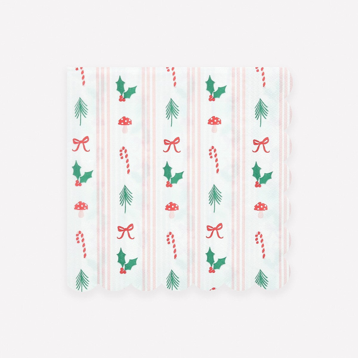 Warum sich für nur ein Weihnachtsmotiv entscheiden, wenn du gleich mehrere ikonische Designs auf deinem Tisch haben kannst? Inspiriert von nostalgischen Tapetenmustern kombiniert dieses Design klassisches Rot und Grün mit modernen rosafarbenen Streifen für einen frischen, verspielten Look. Der gewellte Rand rundet das Design mit einem stilvollen Akzent perfekt ab. Diese großen Papierservietten lassen sich wunderbar mit anderem Partygeschirr kombinieren und sorgen für ein harmonisches Gesamtbild.